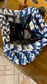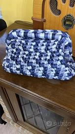 Clutch fatta a mano all uncinetto con fettuccia in lycra sfumata nei colori del blu scuro, blu chiaro, grigio e bianco. Chiusura a molla di 20cm. Borsa foderata all interno. Realizzata con cura e passione. 35€ compresa di spedizione. Possibilità di aggiungere la catena con aggiunta di 5€.