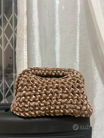 Borsa artigianale intrecciata color marrone caldo, realizzata con lavorazione compatta e curata nei dettagli. Il design è morbido ma strutturato, con una texture intrecciata che dona un aspetto raffinato e originale. Dotata di manico integrato anch’esso intrecciato, è comoda da portare a mano.
