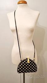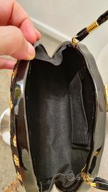 Borsa clutch rigida in forma di mezza luna, la parte frontale è formata da intrecci di nastri di 1 cm di raso, velluto e passamaneria color oro, parte posteriore tessuto satinato. Base e profili in vernice nera, tracollina in vernice nera, chiusura metallica color oro. Parte interna in tessuto cotone nero con taschina e soffietto. La borsa è vintage ma è in buone condizioni. Non ha né l’etichetta della marca né dustbag/scatola originale. Dimensioni: Lunghezza: 18 cm Altezza: 14,5 cm Profondità base: 4 cm Lunghezza tracolla: 123 cm