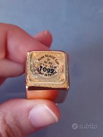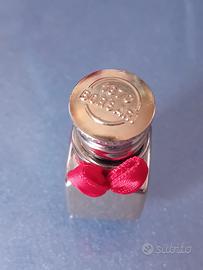 Micro-bottiglia dorata con piccolo fiocco rosso in una bellissima scatola ad anello di velluto rosso a forma di cuore,