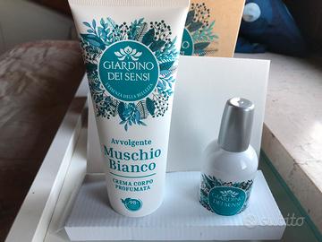 Confanetto Giardino dei sensi al muschio bianco. Contiene 250ml di crema fluida profumata e 100 ml profumo. Nuova mai usata