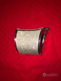 Il bracciale in metallo pesante argentato ha l'apertura a molla, ha ben 106 strasse ed è sabbiato color argento. Nella parte sabbiata appare vellutato al tatto: sensazione piacevole.