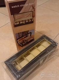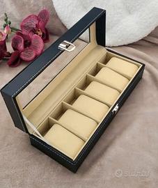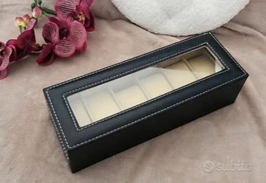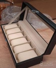 Scatola porta orologi, gioielli e bracciali in ecopelle nera a 6 slot con coperchio in vetro e chiusura a scatto. Imbottitura interna in velluto. Nuovo scatolato. Non trattabile.