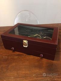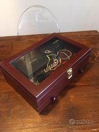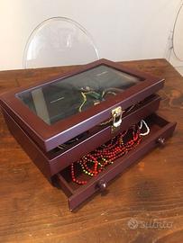 Cofanetto portagioielli Originale Nuovo. In vero legno, perfettamente conservato. Dimensioni 30 cm per 20 cm per 10 cm di altezza. Il cassetto è alto 3,5 cm. Un portagioielli capiente e resistente, in cui custodire preziosi o altro. Comodissimo da utilizzare, bello da esporre e da possedere o da regalare. Utile e raffinato. Un pezzo unico. Introvabile. Bellissimo.