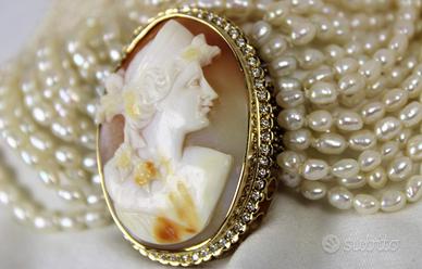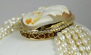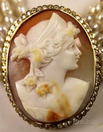 Grande pendente in corniola con cammeo in conchiglia del Madagascar raffigurante un volto di profilo femminile con acconciatura e gioielli tipici di una matrona romana
