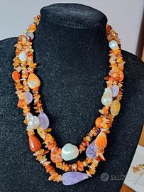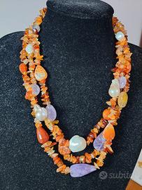 collana 3 fili di cips coneolla + sassi ametista,corneola e perle naturali barocche . il pri mo filo con la chiusura misura cm 55