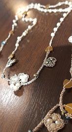 collana a cravatta di filato gioiello, lavorata a mano/uncinetto di colore avorio, oro e verde petrolio. In dotazione un sacchetto in tulle trasparente per una idea regalo.