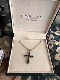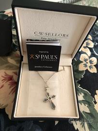 Nuova, mai indossata, ancora in confezione originale. Stile gotico, realizzata a mano, manifattura e materiali inglesi - pietra nera Whitby Jet e argento sterling. Collana originariamente venduta come memorabilia di St. Paul’s Cathedral a Londra. Prezzo originale £240, circa €280.