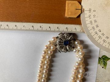 collana a doppio filo di perle a scalare, con fermaglio in oro bianco brillanti e zaffiro, da usarsi anche come spilla, oggetto artigianale