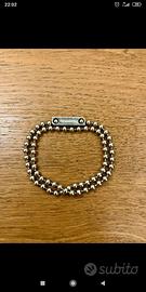 Il marchio è noto per i suoi gioielli componibili e personalizzabili. Presenta uno stile casual con perline metalliche e una chiusura o elemento decorativo con il logo.