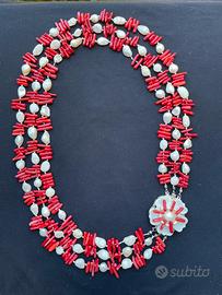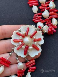 Bellissima collana a tre fili realizzata con vero corallo, perle di fiume naturali con chiusura a forma di fiore in madreperla, lunghezza totale collana aperta 76 cm, peso 180 g, condizioni ottime come da foto
