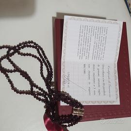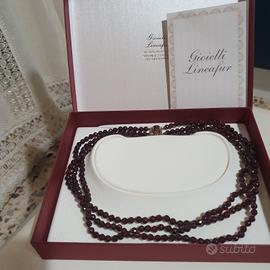 Collana a tre fili paralleli di granato naturale taglio sferico sfaccettato 5 mm. con chiusura in argento 800/1000 , lunghezza 22 cm. ,con certificato di garanzia, e scatola originale ,da oreficeria, nuova mai usata ,per altre informazioni contattare.