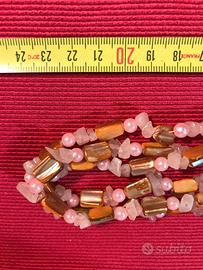 Collana a tre fili con quarzo rosa, madreperla color ambra e perline rosa, chiusura a moschettone in metallo. Cm. 56.