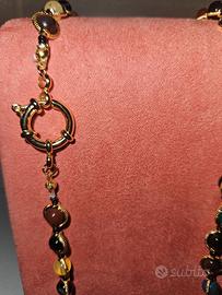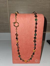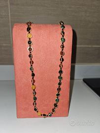 Incastonatura: Ogni pietra è montata in un piccolo anello metallico con bordo dorato, collegato a sua volta agli altri con anellini.