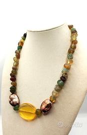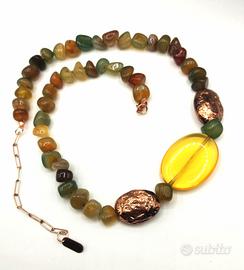 Perfetto con gli outfit dell'Autunno-Inverno questo semplice collier dai bei colori caldi delle foglie , realizzato con Agate multicolori , elementi "ramati" e ovale di Cristallo citrino. Cm.50+ 10 catenella Pezzo Unico non replicabile !