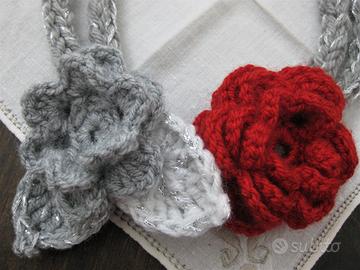 La collana è composta da 2 fili in grigio chiaro+lurex, abbelliti da un fiore "rosso Valentino"(diametro cm 8,5 con quattro strati di petali) e da un fiore grigio chiaro (diametro cm 6,5 con due strati di petali) con due foglie a goccia, in filato bianco e grigio +lurex. Entrambi gli elementi possono essere posizionati in vari modi, grazie ad un "anello" sul retro, che permette loro di scorrere sulla collana.I fili misurano 62cm e 52cm ; si raccordano ad elementi circolari, da cui partono i laccetti per la chiusura, rifinita con piccole sfere argentate. Lavorata completamente a mano.