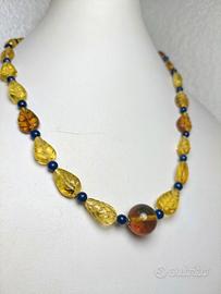 Unica ,spettacolare rara ,collana di ambra naturale lavorata a mano ,lapislazzuli e argento.