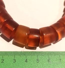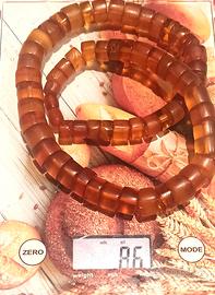Vendo collana antica grande in ambra naturale non trattata di straordinaria bellezza. Realizzata prima della Seconda Guerra Mondiale, durante il periodo Art Déco. L'ambra si presenta in ottime condizioni sia per trasparenza che per brillantezza del colore. La lunghezza della collana è 58 cm. Le perle hanno forma cilindrica e aumentano progressivamente di dimensione verso il centro: la perla più piccola ha un diametro di 6 mm, la più grande di 15 mm. Il peso è 86 grammi