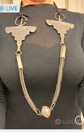 Collana, provenienza Marocco. Argento vecchio, peso 155 gr. Questo gioiello in Marocco veniva usato come collana nelle importanti occasioni e talvolta indossato anche come ornamento sul capo. Oggi è un gioiello etnico molto originale e decorativo. Dimensione dei triangoli d'argento 9x7 cm. Lunghezza totale compreso il cordone nero 22 cm.
