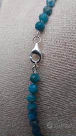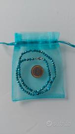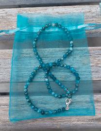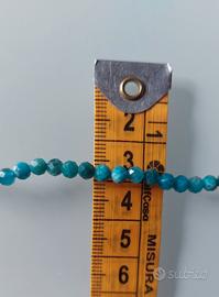 Collana girocollo a un giro realizzata con perle sfaccettate di Apatite Blu ( pietra naturale di mm 4, vedi foto per dimensione) e gancino in Argento 925. 📌📌📌Lunghezza collana, compreso chiusura, cm 40.5📌📌📌 Consegno con sacchettino organza-Nuova