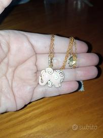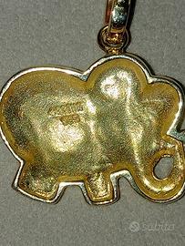 pendente in argento 925 placcato oro giallo ha elefante in smalto a fuoco rosa/bianco con bordi profilati in dorato con contro maglia apribile e cubic zirconia applicati sul davanti
