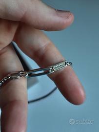La chiusura é particolare, dotata di una placchetta su cui é presente il marchio ed un gancio allungato che si inserisce nell'apposito foro. Questo dettaglio é unico e conferisce al gioiello uno stile caratteristico, iconico e versatile.