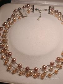 collana in argento con tre fili di perle di fiume a scalare sfumate rosa lunghezza regolabile