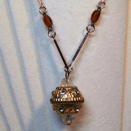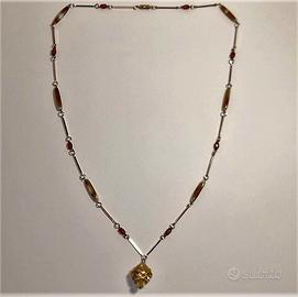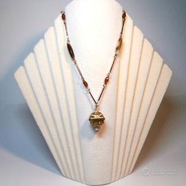 La collana è composta da una catena di una lunghezza complessiva di cm 80 e un peso complessivo di gr 16. Composta da segmenti di metallo lunghi cm. 2,5 alternati a segmenti color bianco con striature color marrone di misura cm. 2,5, e culminante in un pendente dorato di cm. 3x2. Chiusura a vite. Si tratta comunque di un oggetto nuovo, mai indossato.