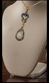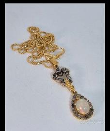 Collana nuova in oro giallo 9 kt e argento con pietra principale ovale opale (1,20 ct) e 33 diamanti taglio antico (0,45 ct) circostanti, peso totale 3,73 g, lunghezza collana 45 cm, pendente 3,90 cm, stile Art Déco, realizzata a mano da maestro orafo.
