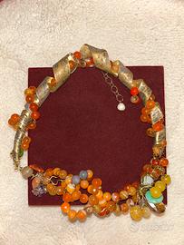 Collana artigianale Altre Terre, con pietre naturali nei toni dell’arancio e dettagli color oro anticato. Stile boho, design ricco e originale. Pezzo importante, non industriale, completo di certificato di garanzia. NUOVA, mai usata, vendo perché non rispecchia il mio stile.
