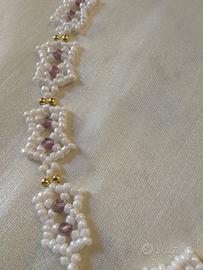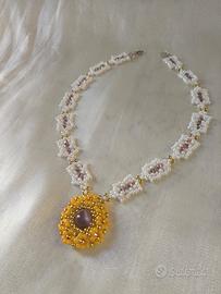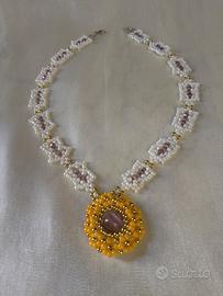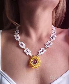Questa collana è un inno alla lavorazione artigianale meticolosa. Il suo elemento distintivo è la catena, interamente tessuta a mano con l'utilizzo di Miyuki giapponesi, note per la loro precisione, nel delicato color avorio.