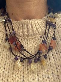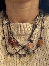 Collana lunga realizzata a mano con cordoncino marrone e pietre naturali di diversi colori e forme, tra cui graziose stelline in toni caldi (ambra, arancio, avorio e ametista). Può essere indossata lunga o avvolta più volte per creare un effetto a più giri.