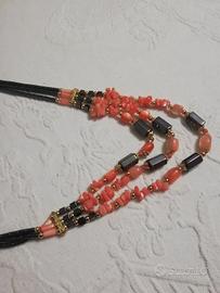 Bellissima collana artigianale a 3 fili, degli anni 80, vintage. Realizzata con pregiato corallo rosa naturale e pietre scure naturali (onice). In perfette condizioni. Mai indossata.