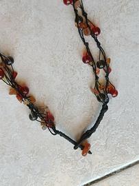 Collana realizzata interamente a mano con pietre naturali di agata corniola (in tonalità rosso, ambra e nero) di varie dimensioni, lavorate con fili intrecciati.