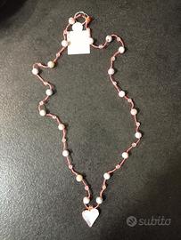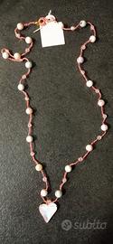 collana lunga realizzata a mano con la tecnica dell' uncinetto in cotone rosato con perline in cristallo colorate con un ciondolo a forma di cuore in dorato e bianco con riflessi arcobaleno... Indossata è una meraviglia,fashion e romantica...