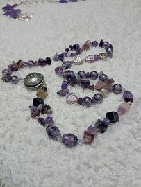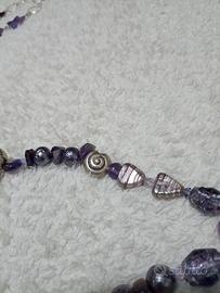 lunga collana con pietre dure (ametiste) inserti in argento centrale in argento indiano altri componenti in ceramica e vetro tutti nei toni del viola,lilla mai indossata