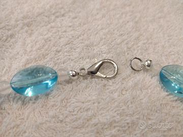 Luminosa collana di perle ovali azzurre inframmezzate da perline bianche. Tutto in vetro e chiusura di acciaio. Fatta da me