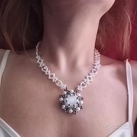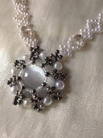 Collana Perle Medaglione stile Vintage neo Vittoriano con medaglione Gemma Occhio di gatto bianco. Questa collana artigianale, realizzata in Italia con la tecnica del bead weaving, accosta un medaglione centrale in pietra occhio di gatto a rondelle di cristallo grigio e perle cerate bianche. La lavorazione include dettagli in ottone e vetro argentato, con una chiusura in acciaio inossidabile priva di nichel. Lunga 45 cm, l'opera è frutto di un processo manuale che esclude l'uso di colle o materiali tossici. Il design, pur richiamando uno stile vintage, si adatta ad abbinamenti quotidiani con tessuti in denim o pelle. Si tratta di un modello unico che punta sulla qualità dei materiali certificati e sulla precisione della manifattura.
