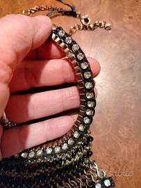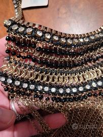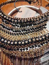 collana "Cleopatra" girocollo in metallo dorato con strass incastonati e lunghe catenelle.