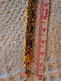 Descrizione: Aggiungi un tocco di luce dorata al tuo stile con questa splendida collana a catena. Caratterizzata da maglie piatte con un raffinato motivo a spirale/geometrico, questa collana di bigiotteria di alta qualità cattura la luce ad ogni movimento.