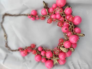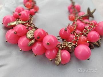 Collana di bigiotteria dal design vistoso e originale, composta da numerose perle sintetiche colore rosa (contattami se vuoi altre foto )di varie dimensioni, montate su una catena bronzata con elementi decorativi e charms marini effetto vintage.