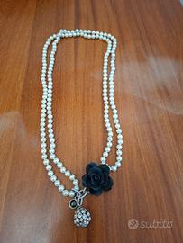 Bella collana bigiotteria di perle con rosa nera e pendente luminoso