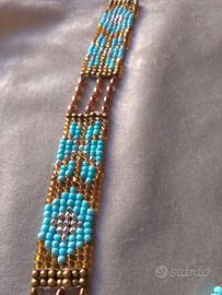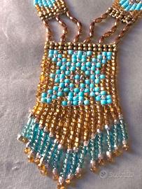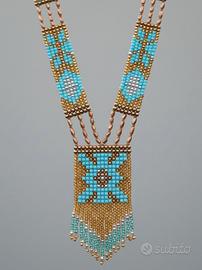 Questa splendida collana intessuta mano a V cattura l'attenzione con la sua meticolosa lavorazione a bead weaving utilizzando perline Rocailles. I colori dominanti sono un caldo oro e un vibrante azzurro, creando un contrasto sofisticato e accattivante. La parte centrale presenta un elaborato pendaglio di forma rettangolare, ricco di motivi floreali o geometrici che richiamano uno stile etnico e boho-chic. Il pendaglio si conclude con una delicata frangia di perline che aggiunge movimento e un tocco di eleganza. Le sezioni laterali che formano il colletto riprendono gli stessi motivi e combinazioni di colori, conferendo all'intero gioiello una notevole armonia e coesione. È un accessorio distintivo, perfetto per chi ama i pezzi d'impatto che evocano le suggestioni dei Nativi d'America.