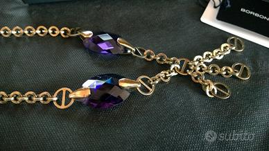 Collana Borbonese dorata con due grandi cristalli color ametista. Indossata pochissimo, con la sua confezione originale.