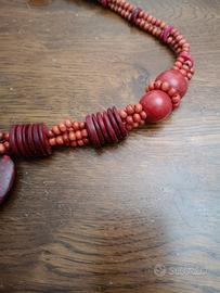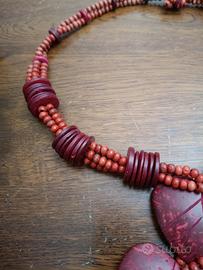 Collana bordeaux realizzata con perline e dischetti. Al centro ciondolo a forma di due foglie e pendente di perline (4 fili). Il materiale dovrebbe essere legno leggero.