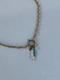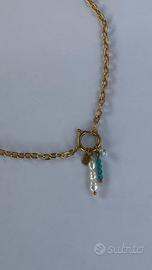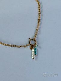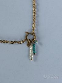 Mini perle di fiume naturali barocche🐚, targhetta con incisione lettera iniziale🔡, cristalli turchese 💎 e fiorellino di perline di turchese🌸