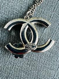 Collana Chanel in ottime condizioni, in metallo argentato e smalto nero. Doppia CC intrecciata con camelia. Completa di scatola originale e sacchetto Chanel. Lunghezza 24 cm, dimensioni logo CC 3 cm