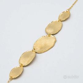 Collana donna Chimera in argento 925 dorata. La collana è lunga cm. 45,5 +5 ed ha un centrale formato da 5 dischi ovali con la lavorazione satinata. Prodotto made in Italy munito di marchio di fabbrica come da legge e completo di confezione e certificato di q1ualità rilasciato dalla Gioielleria.