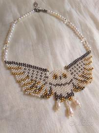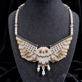 Questa bellissima collana girocollo Made in Italy è un capolavoro di artigianato, caratterizzata da un raffinato pendente a forma di gufo interamente intessuto a mano. La trama preziosa unisce beads di ottone a perline bianche cerate e dorate, arricchita da tre eleganti perle di fiume naturali pendenti che donano un tocco di luce unico. Lunga 43 cm e rifinita con una sicura chiusura a moschettone in ottone, questa creazione esclusiva si adatta perfettamente a ogni outfit e stagione. Realizzata con la tecnica bead weaving senza l'uso di colle o nichel, rappresenta un gioiello di alta qualità per chi ama lo stile distintivo.