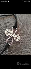 Collana choker con ciondolo in filo di alluminio color argento spesso 2mm, fatto a mano + cordino in eco-pelle nero.
